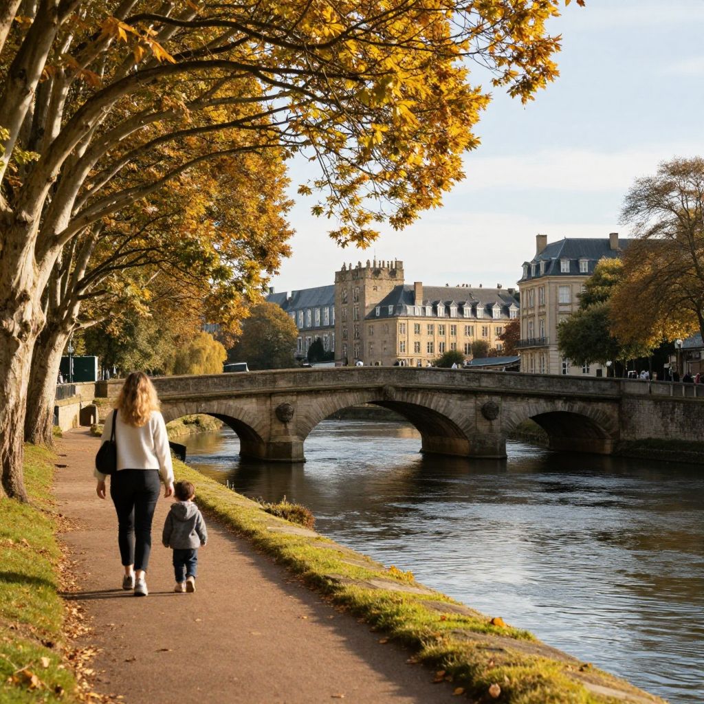 Autumnal sunlight bathes a serene riverside scene featuring a stone bridge spanning a calm waterway, with a woman and child walking along a tree-lined path beneath golden foliage, while historic buildings stand majestically in the background.