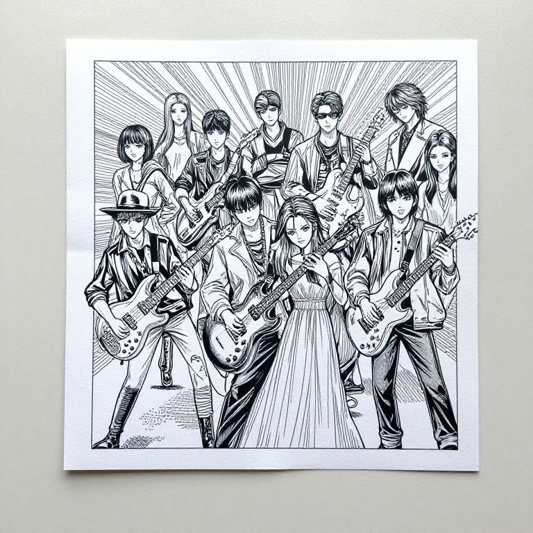 Folded Paper Art old school 60 years old musicians group, comic manga manifest, fine line painting, cool,