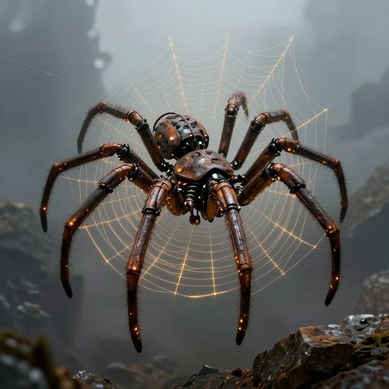 A colossal mechanical spider, its rusted limbs adorned with glowing embers, weaves an ethereal web of golden light against a misty, otherworldly backdrop, defying gravity as it hovers above a rocky landscape.