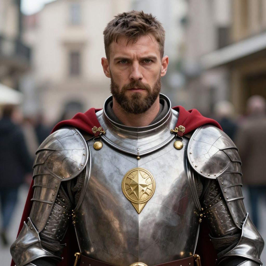 "Sorcery a photograph of a medieval-fantasy roman legionaire around 40 years old, short beard, round shield, leather armor,"