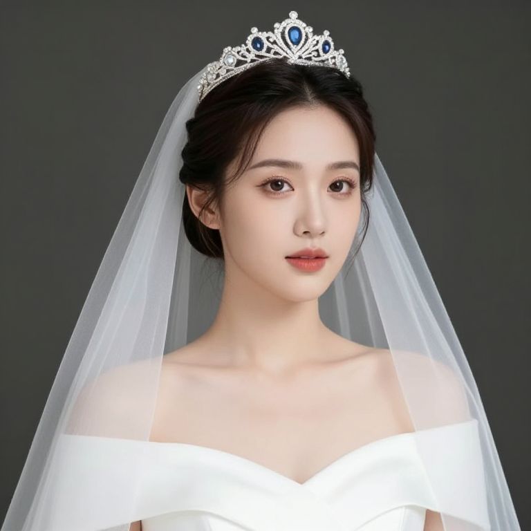 Female wearing a white dress with a veil and a tiara on her head.