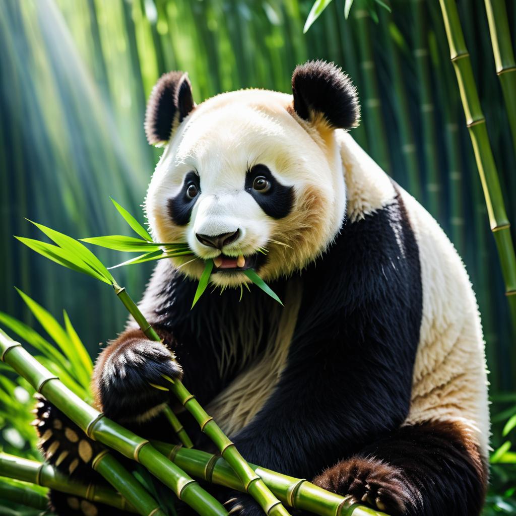A photorealistic high-detail image of a giant panda holding and eating fresh green bamboo stalks. The panda is illuminated by sunlight, surrounded by lush green bamboo plants. The focus is on the panda's face and its expressive eyes, captured using a 35mm lens.
