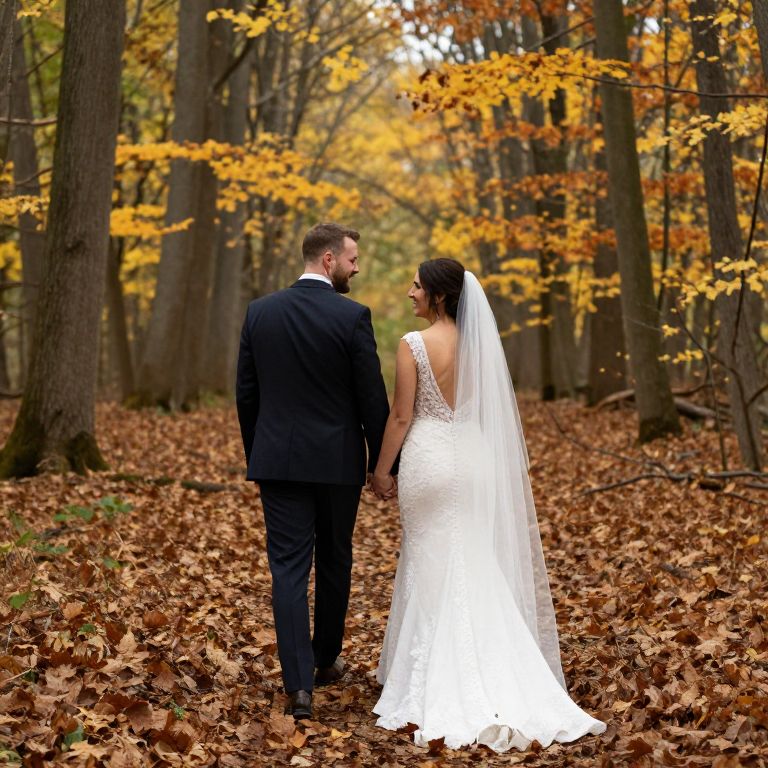 Photograph of a bride and groom walking hand-in-hand through a forest during autumn. The groom, in a dark suit, has short brown hair and a beard. The bride, with dark hair in an updo, wears a white lace wedding dress with a long veil trailing behind her. The forest floor is covered in brown leaves, and tall trees with yellow and orange leaves line the path. They're smiling at each other, creating a romantic, serene atmosphere.