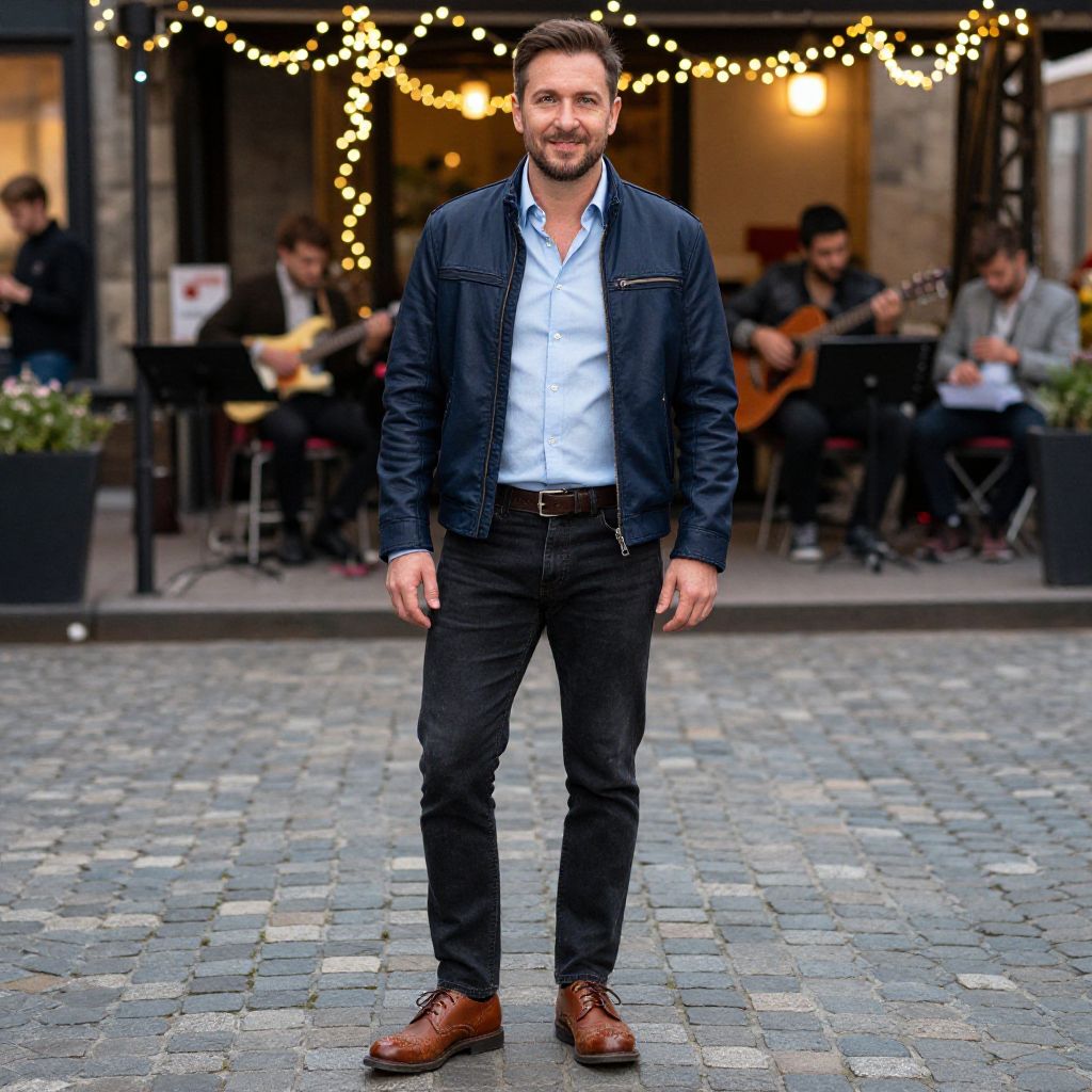 A man, navy blue leather jacket, light blue button-up shirt, faded black skinny jeans, brown brogue shoes, casual leather belt, charming cobblestone square, local musicians, twinkling lights, camera obscura style, relaxed smile, warm ambiance. Man has masculine face and piercing eyes