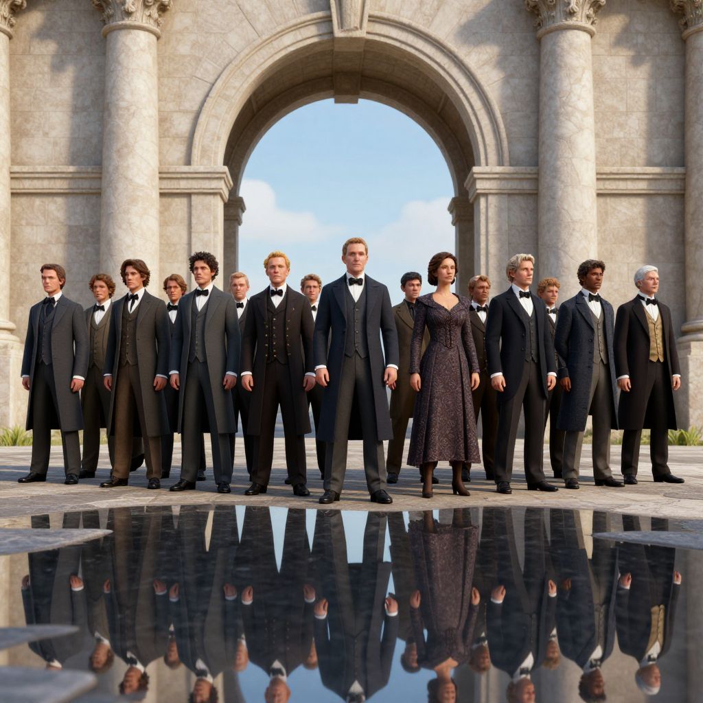 A solemn procession of figures in Victorian attire stands before a grand archway, its structure suspended by ethereal ropes that defy gravity, while puddles below reflect an impossible, mirrored world where reality fractures into infinite possibilities.