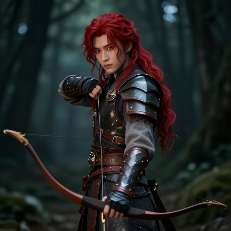 Photograph of an Asian male with short, dark green hair, wearing a green, leafy costume with iridescent, insect-like wings glowing with a luminescent, ethereal light. The wings are semi-transparent with intricate, glowing vein patterns. The background is a mystical forest with dense, dark trees and soft, blue-gray light filtering through. The forest floor has patches of moss and small plants. The character stands confidently in the center, with a focused expression, highlighting the magical and otherworldly ambiance of the scene. The costume and wings create a fairy-like, fantasy aesthetic.
