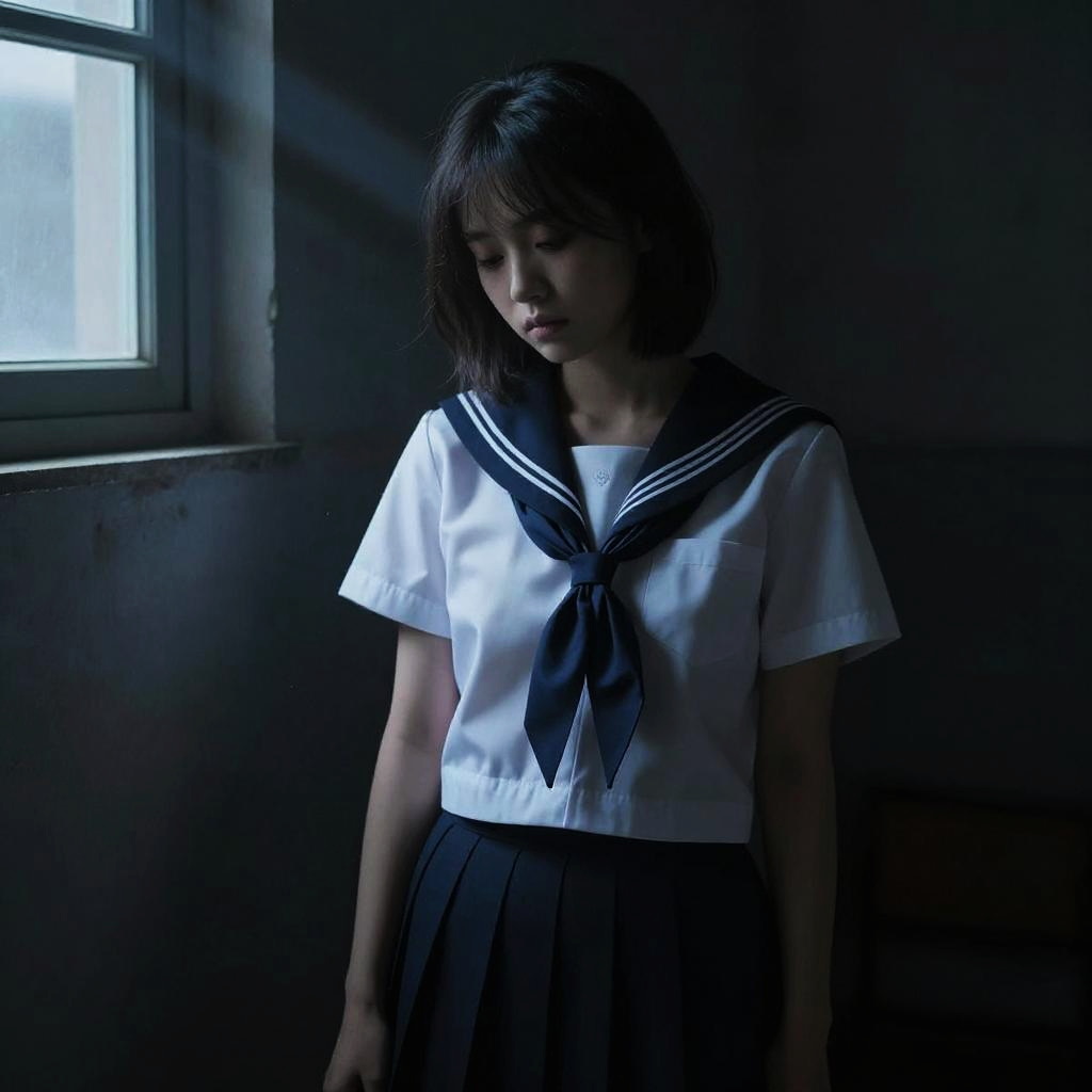 Best quality, masterpiece, ultra high res, (photorealistic:1.4), raw photo, (Authentic skin texture:1.3), (film grain:1.3), panorama, character portrait, very wide shot, Full body, narrow waist, cowboy shot, in the dark, deep shadow, low key, cold light, night, indoor, a beam of light, dust, Tyndall effect, sad, disappointed, gloom (expression), hollow eyes, against window, 1girl, beautiful detailed eyes and face, JK_style, short-sleeved JK_shirt, short-sleeved JK_sailor, JK_suit, JK_tie, off shoulder, head down, brown eyes