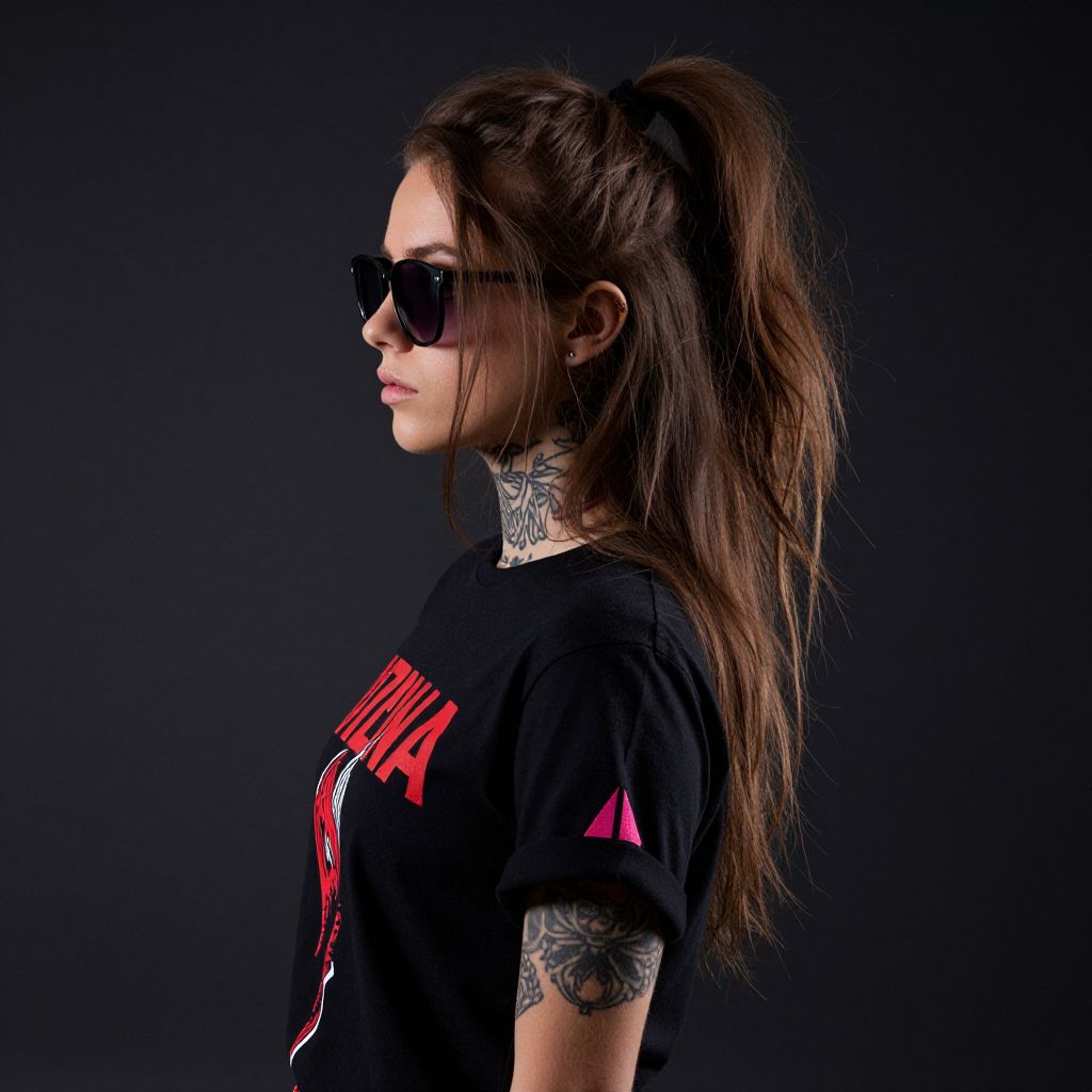 Photograph of a young woman with long, messy brown hair in a high ponytail. She's wearing dark sunglasses and a black t-shirt with a red graphic and a pink triangle on the sleeve. Her multiple tattoos are visible on her neck and arms. She's looking to the side against a dark, minimalist background. She has a confident, edgy vibe.