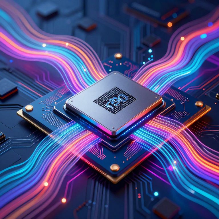Photorealistic digital image of a silver CPU chip with a black square logo centered on a dark blue circuit board. Vibrant, neon-like blue, pink, and purple wavy lines radiate from the chip, resembling electric currents. The circuit board has intricate, glowing, golden connectors and fine lines. The background is blurred, focusing on the CPU chip and the colorful lines. The image has a high-tech, futuristic feel with bright, contrasting colors and sharp details.