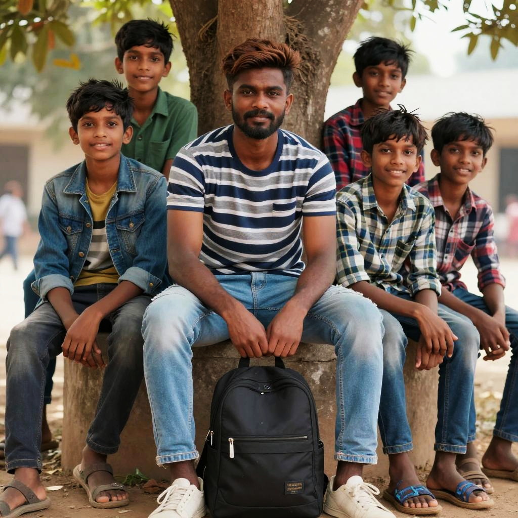 A group of five boys riding bicycles on a road surrounded by greenery. The foreground features two boys wearing helmets and casual clothing, including a black shirt and a blue jacket. The scene takes place during the day with trees and grass visible in the background.