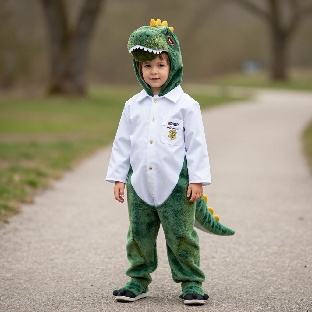 Paleontologist Kid Costume, child in a dinosaur costume standing on a path