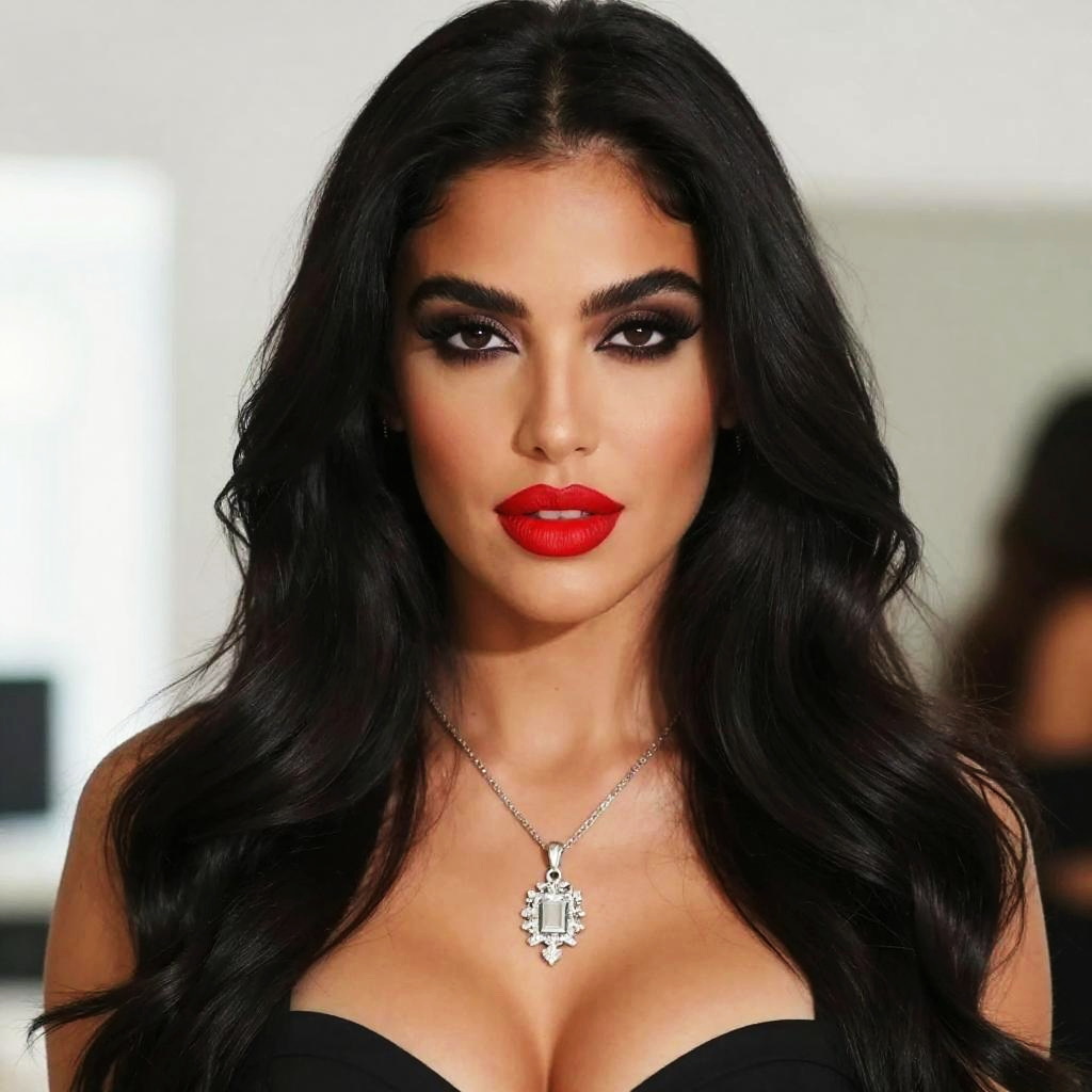 Photograph of a woman with long, wavy black hair and bright red lipstick, looking directly at the camera. She has dark, smoky eye makeup and a silver necklace with a pendant. Her deep cleavage is visible in a low-cut top. The background is blurry, suggesting an indoor setting with bright lighting. Her skin tone is light, and she has a confident expression.