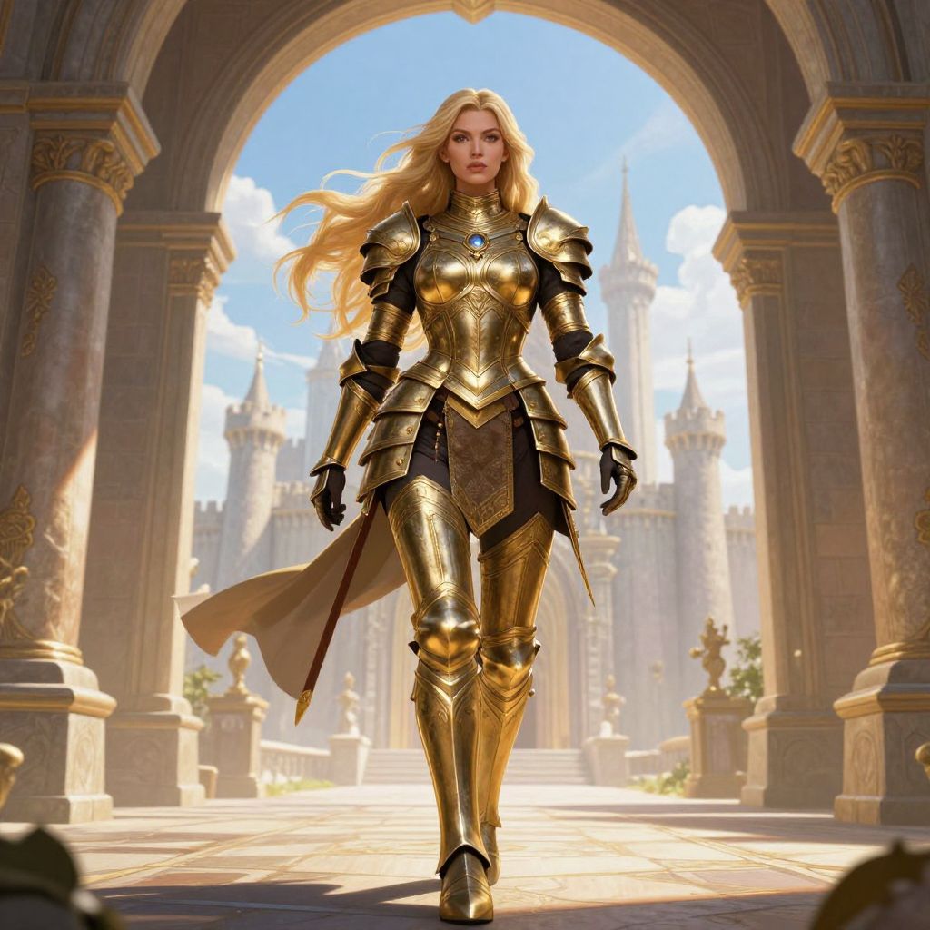 Digital art of a blonde woman in golden medieval armor, walking through a sunlit, grand stone archway with a castle in the background.