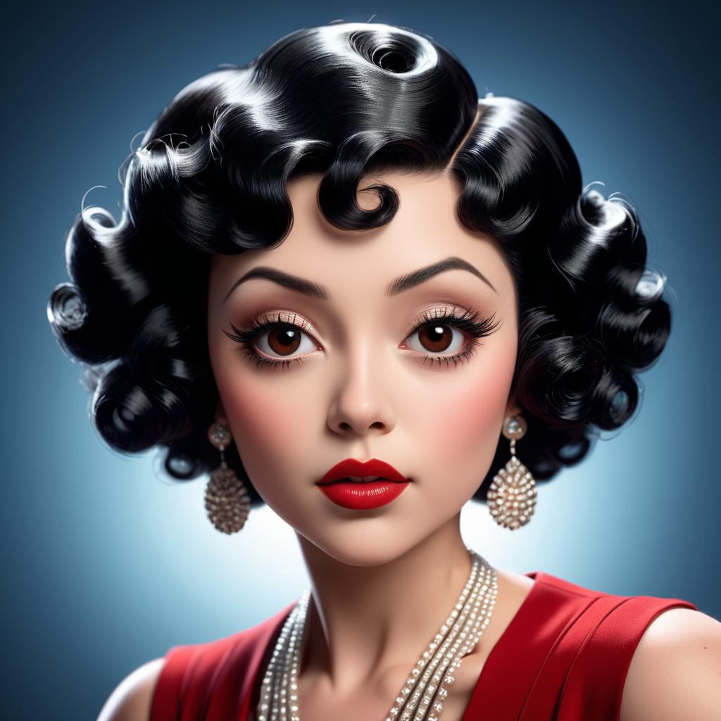 Ultra-realistic portrait of a glamorous jazz singer styled as Betty Boop, shot on a DSLR, cinematic lighting, high detail, soft skin texture, glossy red lips, 1920s vintage aesthetic, inspired by Annie Leibovitz, cinematic portrait.