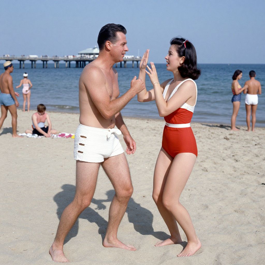 Photograph of a sunny beach scene with clear blue skies. A middle-aged man with short dark hair, wearing white swim trunks, and a middle-aged woman with short black hair, in a red one-piece swimsuit with a white top, are standing facing each other and raising their hands in a playful gesture. In the background, several people are scattered across the sandy beach, including a man in blue swim trunks and a woman in a white bikini, near the water's edge. A wooden pier extends into the sea, with a few people on it. The ocean is calm with gentle waves.