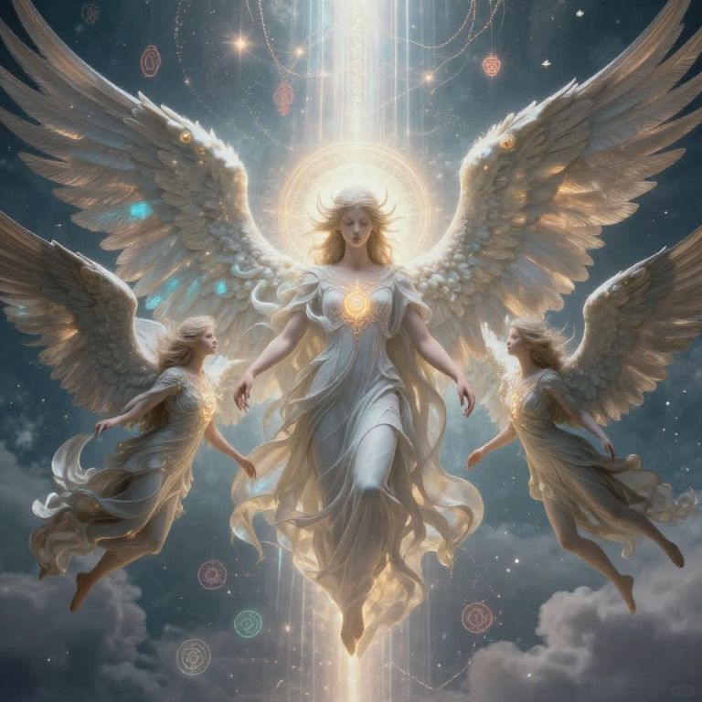 Digital artwork of a celestial scene featuring a central, radiant, angelic woman with large, glowing white wings, dressed in a flowing, white, Grecian-style gown. She has a halo and a glowing heart at her chest. Two smaller angelic figures, with similarly detailed wings, float beside her on either side. The background is a starry, dark blue sky with light beams emanating from above. Sparkling, colorful, circular patterns are scattered around, adding a magical element. The overall style is highly detailed and ethereal, with a focus on light and divine beauty.