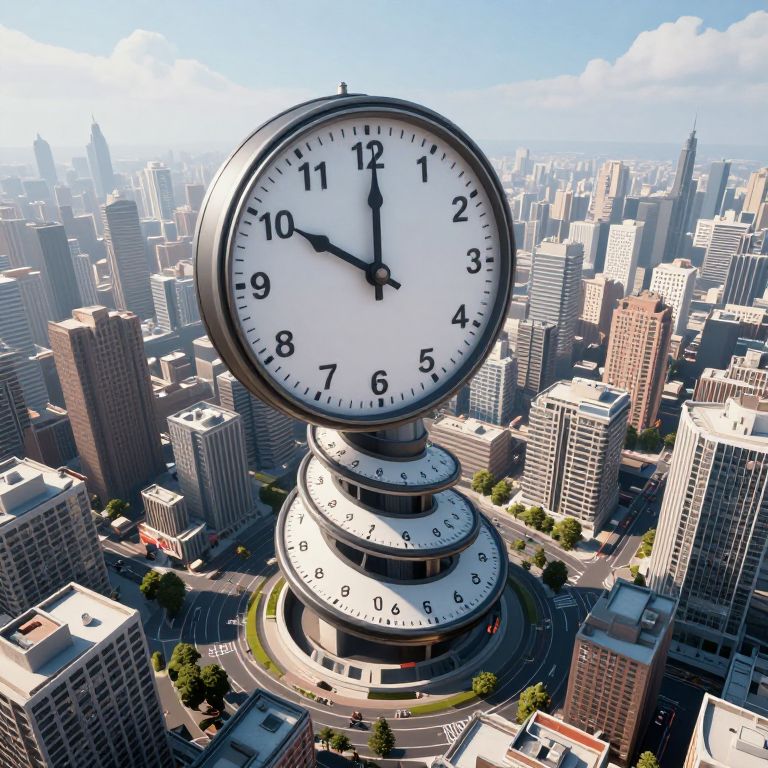A surreal 3D-rendered cityscape features a towering clock spiraling upward, its hands ticking backward from midnight to noon before accelerating infinitely, creating a mesmerizing temporal vortex that traps the urban landscape in a dreamlike, cyberpunk-inspired reality.