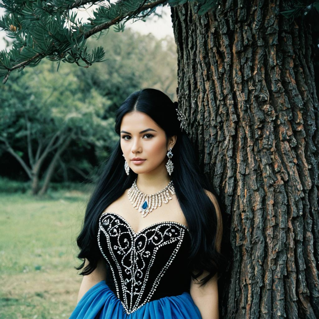 Portrait of a young woman with long black hair styled with a yellow flower and black hair ornament, wearing a yellow dress with ruffled frills and black trim. She stands confidently outdoors in a field of yellow flowers, wearing a black necklace and holding her hands on her waist. The background is blurred, emphasizing the detailed features and attire of the subject.