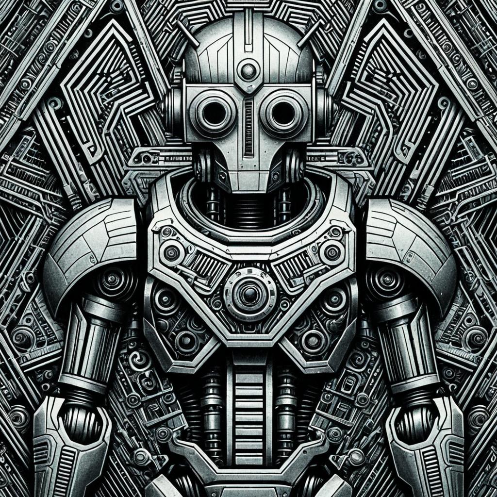 Realistic photo.robotic being with intricate linework and absurd proportions, style inspired by Basil Wolverton, metallic hues, geometric patterns
