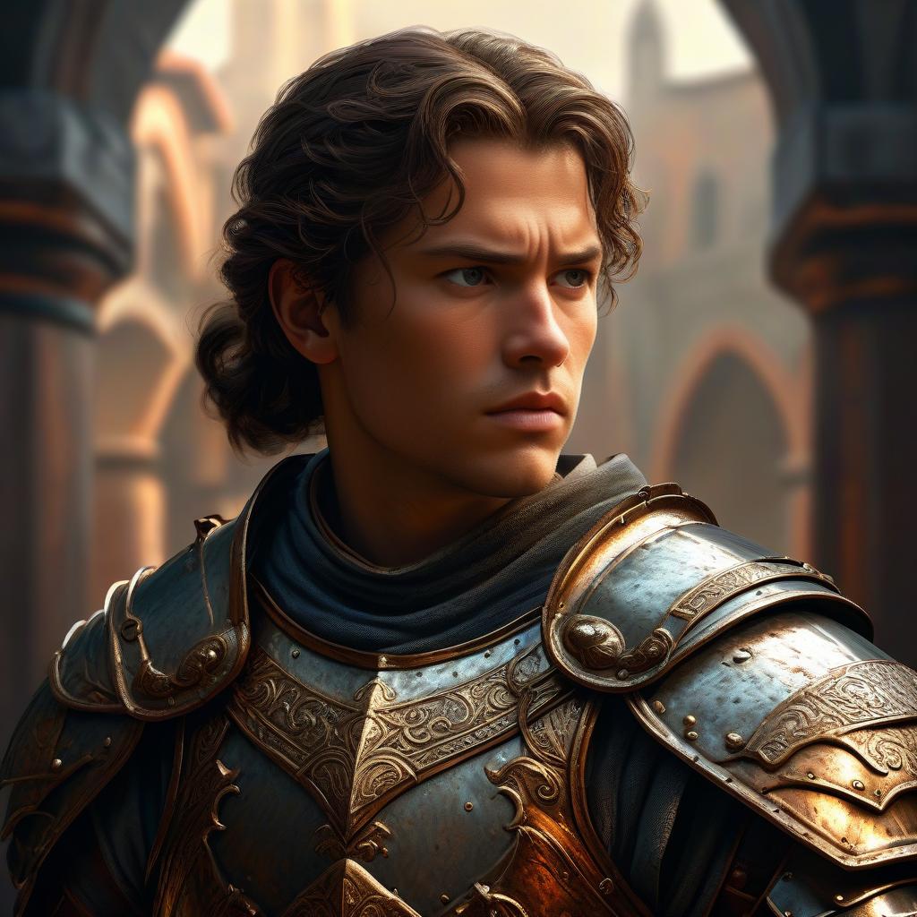 Portrait of a young medieval knight wearing intricately designed golden plate armor with engraved details. The knight has wavy, shoulder-length brown hair and a focused, serious expression. The background features warm, blurred architectural elements resembling a historic castle or cathedral.