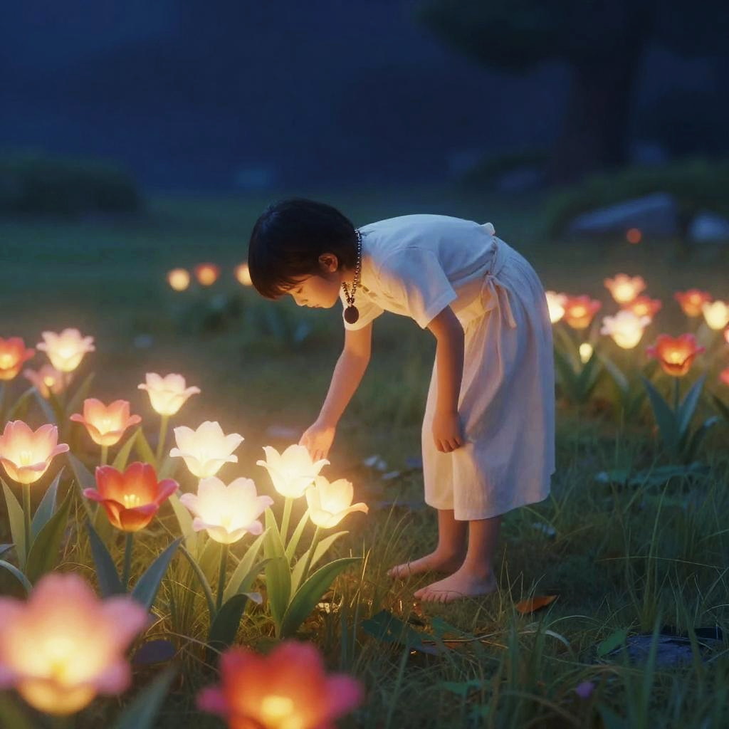 Bending over pose, surreal fantasy landscape with a character bending over to touch glowing flowers, ethereal light, mystical atmosphere, vivid colors
