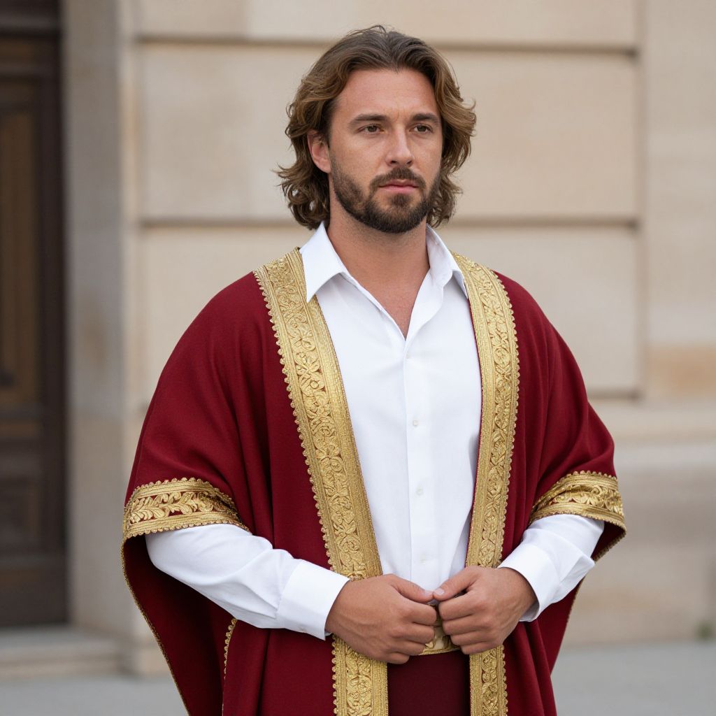 Roman Fancy Costume, man in a white shirt and a red and gold shawl