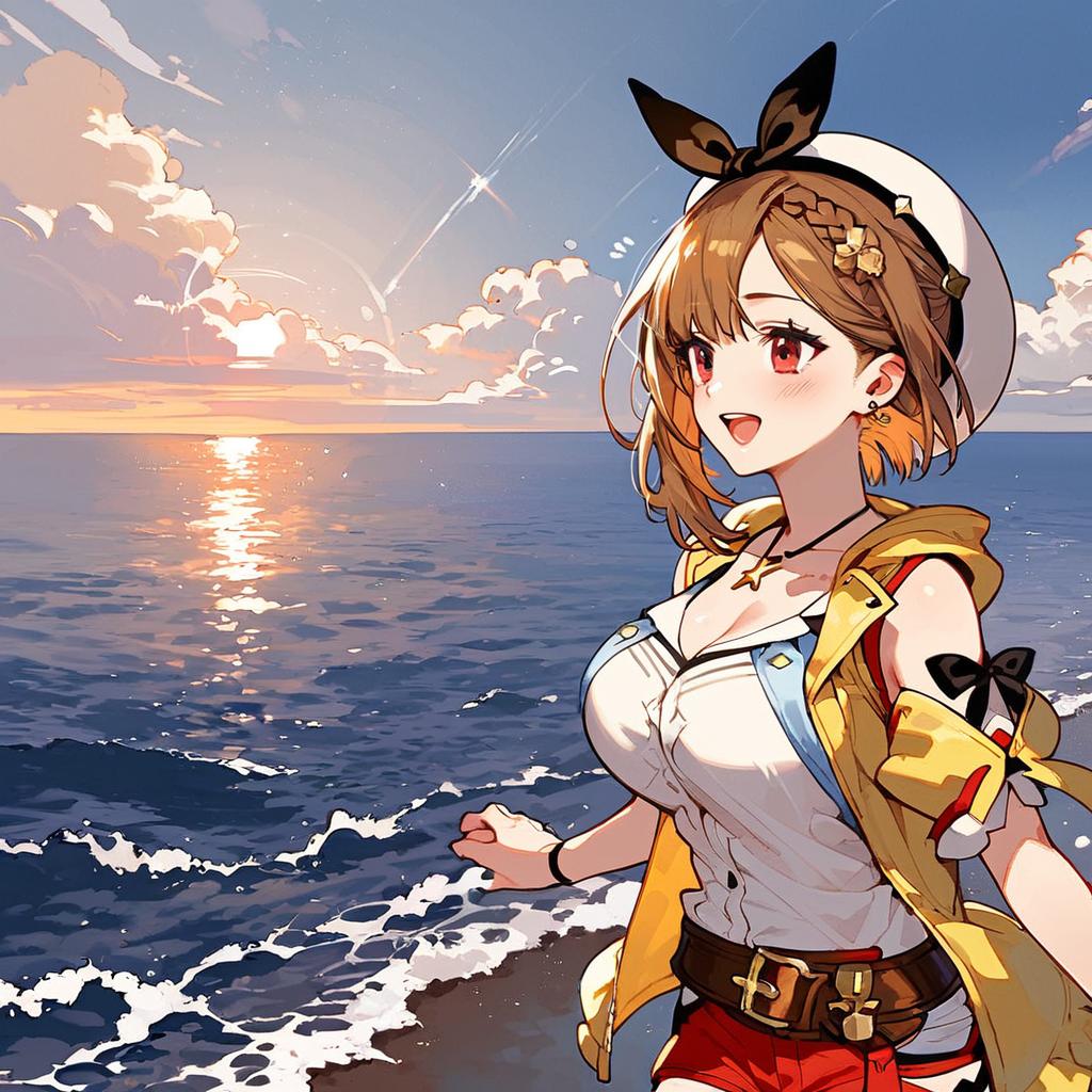 Score_9, score_8_up, score_7_up, score_6_up, score_5_up, score_4_up, gradient background, refraction, caustics, rim lights, backlighting, bloom, shadow, source_anime, day, outdoors, lens flare, dappled sunlight, sunlight, sunbeam, water, ocean, waves, landscape, clouds, sky, reflections, fantasy, illustration, scenery, atelier ryza, reisalin stout, 1girl, solo, brown eyes, light blush, open mouth, happy, brown hair, short hair, bob cut, cross hat ornament, black bow, hair bow, yellow jacket, frilled jacket, sleeveless jacket, white shirt, star necklace, red shorts, belt buckle, belt, cleavage, large breasts