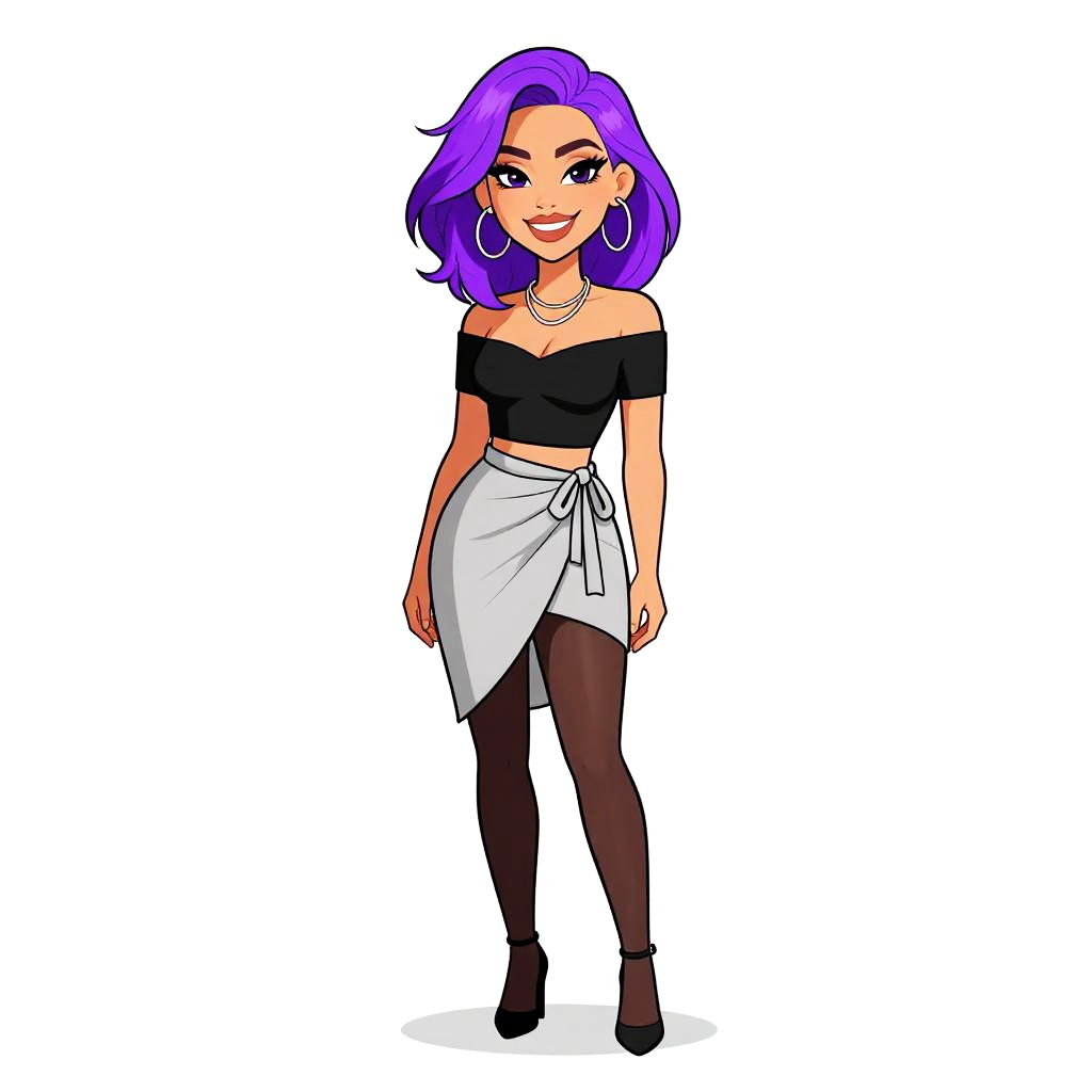 Woman with pretty face and pretty hair. smiling Woman, edgy streetwear, black cropped long-sleeve top with sheer polka dot panel, high-waisted faux leather shorts, ankle boots with chunky heels, plain white background. --sref 1467