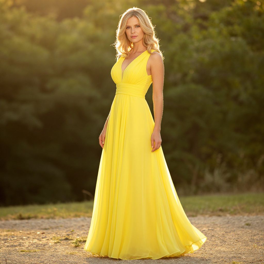 Photograph of a blonde woman in a vibrant yellow, sleeveless, V-neck gown standing outdoors with sunlit, green foliage background.