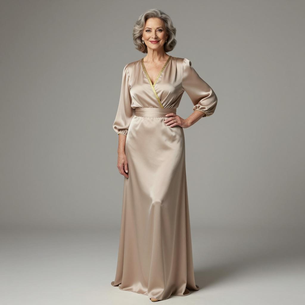 Photorealistic portrait of an older Caucasian woman with gray short wavy hair, standing confidently against a neutral gray background. She is wearing a long beige satin dress with gold trim, featuring a V-neck, puffed sleeves, and a cinched waist. The woman is smiling softly with her hand resting on her hip, showcasing an elegant and poised demeanor.