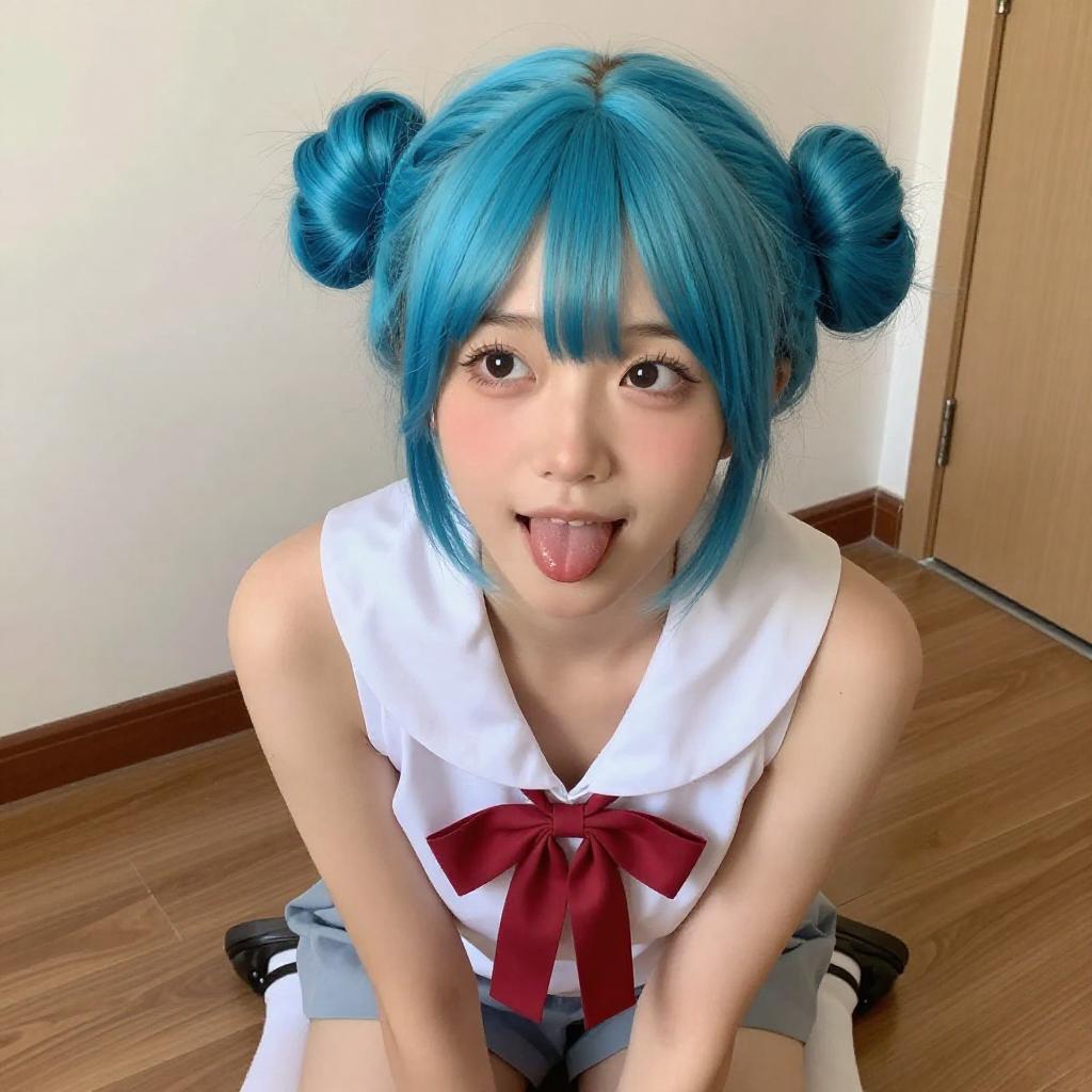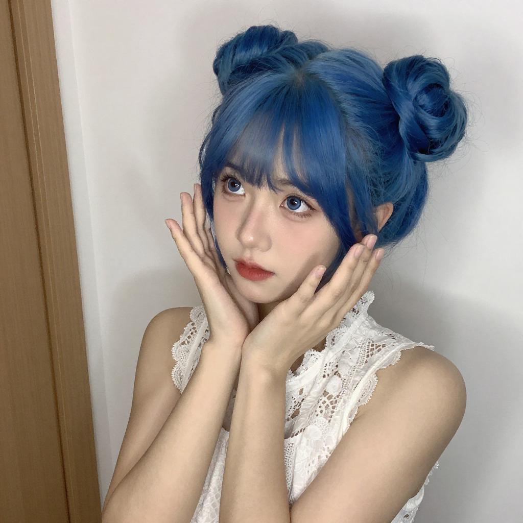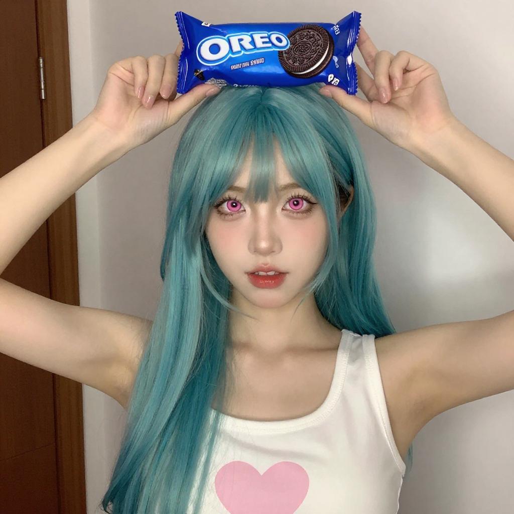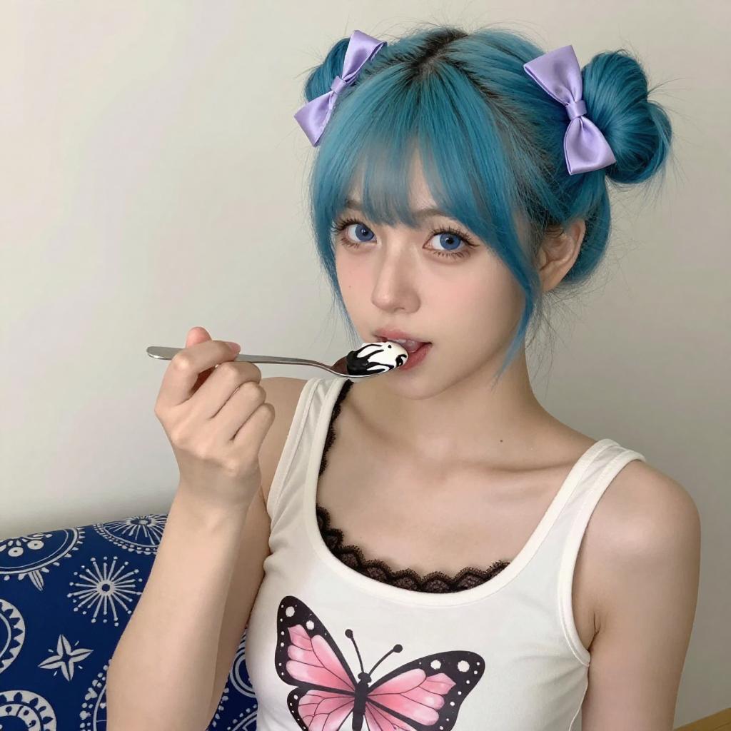 Photograph of a young woman with bright turquoise twin buns and long hair, wearing a white sleeveless top. She has large, expressive eyes with pink eyeshadow and red lipstick. She holds a blue snack pack close to her chest, looking up at the camera with a slightly shy expression. The background is a plain white wall with a wooden door frame on the left.