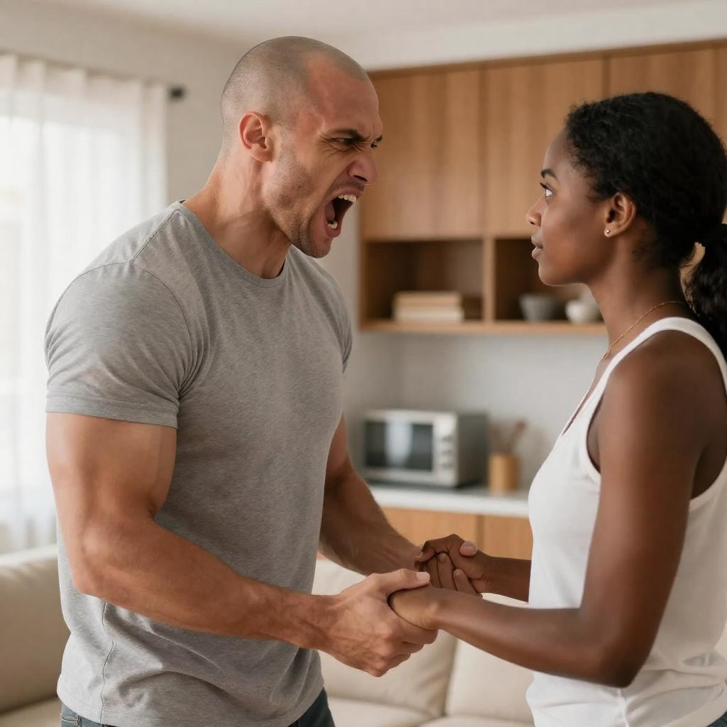Photograph of a man and woman in a living room. The man, muscular, bald, wearing a gray t-shirt, yells with mouth open. The woman, dark-skinned, black hair in a ponytail, wearing a white tank top, holds his hand while looking at him. Wooden cabinets, white curtains, and a couch in the background. Man's expression is intense, woman's expression neutral.
