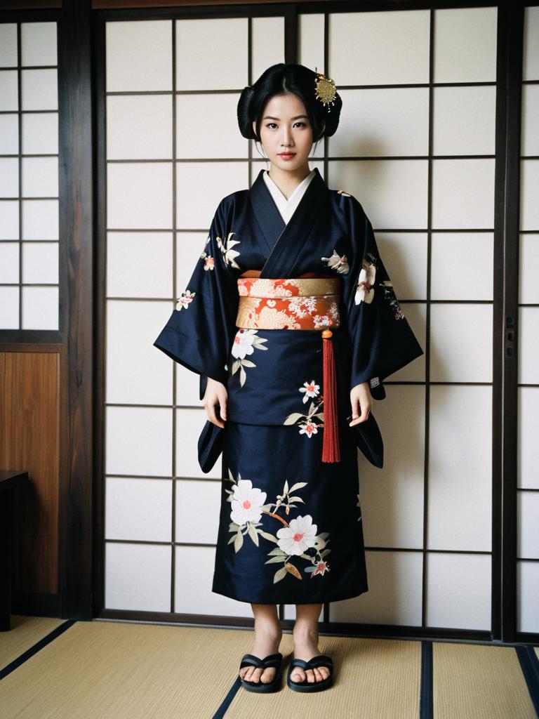 Japanese traditional, 1girl, solo, japanese clothes, black hair, kimono, sandals, hair ornament, looking at viewer, standing, full body, jewelry