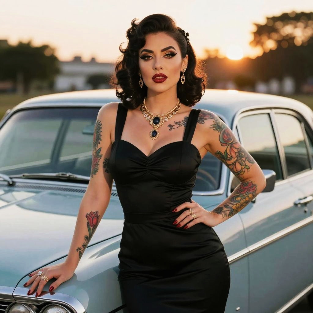Blonde woman with vibrant tattoos on her arms and shoulder, wearing a black crop top and blue jeans, standing on a balcony overlooking a cityscape with modern buildings under a clear blue sky. The image captures a bold, edgy urban look with a contemporary aesthetic.
