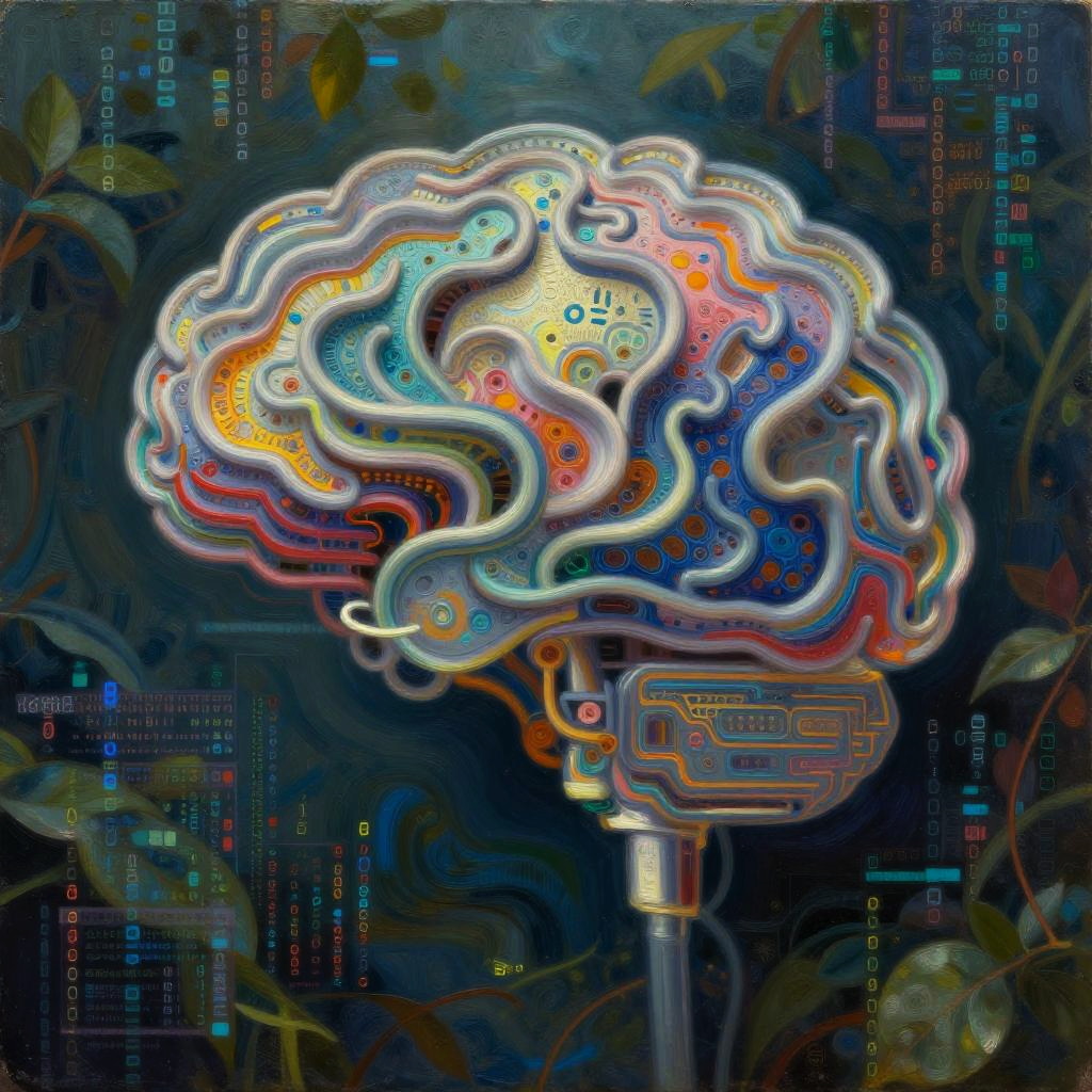 AI picture to art generation, a surreal scene of a machine learning algorithm visualizing data into a lush, detailed oil painting, blending hyperrealism with abstract colors, intricate textures and patterns emerging from digital code, artistic fusion of technology and imagination