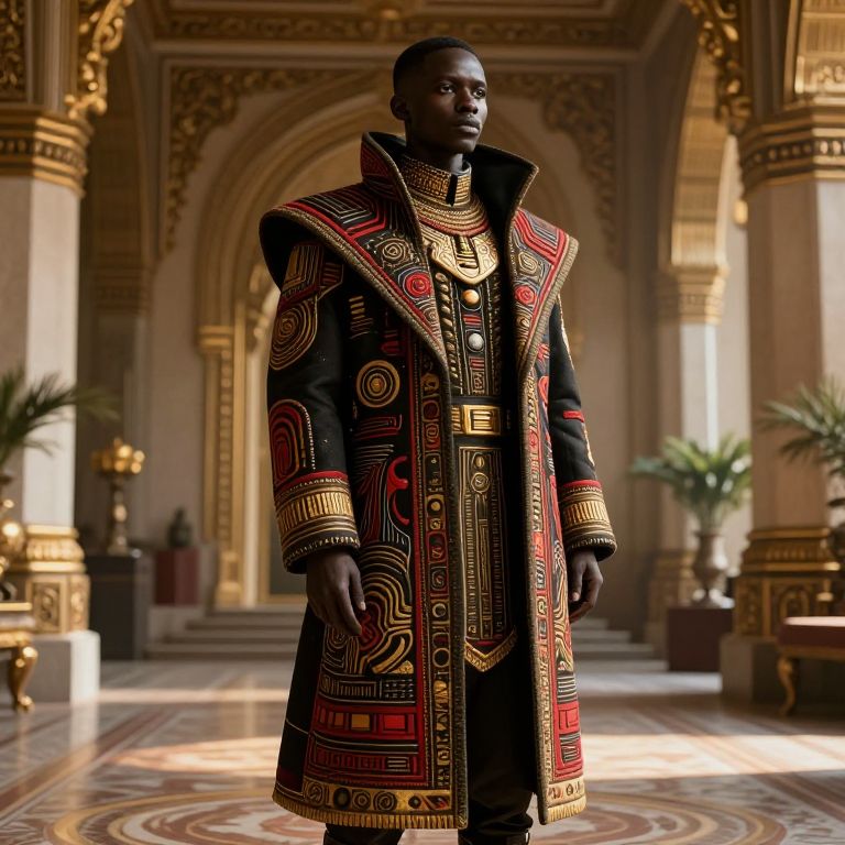 Photograph of a tall, muscular Black man with a trimmed beard and short hair, standing confidently in an ornate, sandy-colored courtyard with intricately carved arches in the background. He is wearing a black, long-sleeved, embroidered vest over a matching black shirt and pants, with a gold pattern on the vest. The vest is open at the front, revealing the shirt. The man's expression is serious, and he stands with his arms relaxed by his sides. The warm, natural light highlights the textures of the vest and the intricate carvings around him.