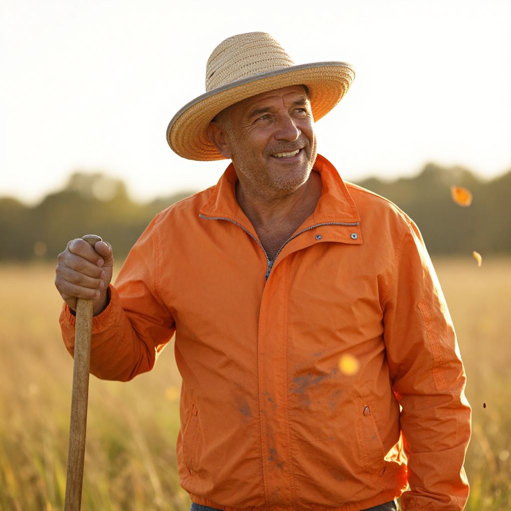 A man with a warm, sun-kissed complexion and a friendly, open expression stands in a sunny meadow, wearing a vibrant orange jacket with a slightly worn zipper and a wide-brimmed straw hat tilted to one side, catching the golden afternoon light. He holds a wooden walking stick, his silhouette framed by the soft hues of the autumn landscape, with scattered golden leaves gently drifting in the breeze.