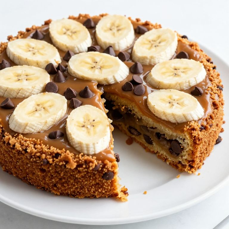 Caramel Banana Upside Down Cake with Chocolate Chips, featuring a golden-brown crust, sliced bananas arranged in a circular pattern atop, and scattered dark chocolate chips, presented on a white plate with a neatly removed slice revealing its moist interior.