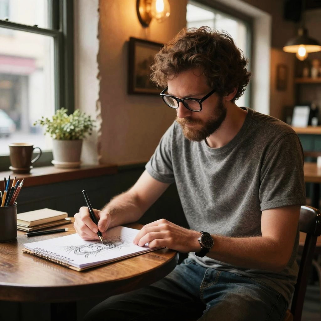 Man with glasses and beard sketching in a rustic coffee shop, vintage decor, natural light from window, casual clothing, artistic and relaxed mood, finely detailed