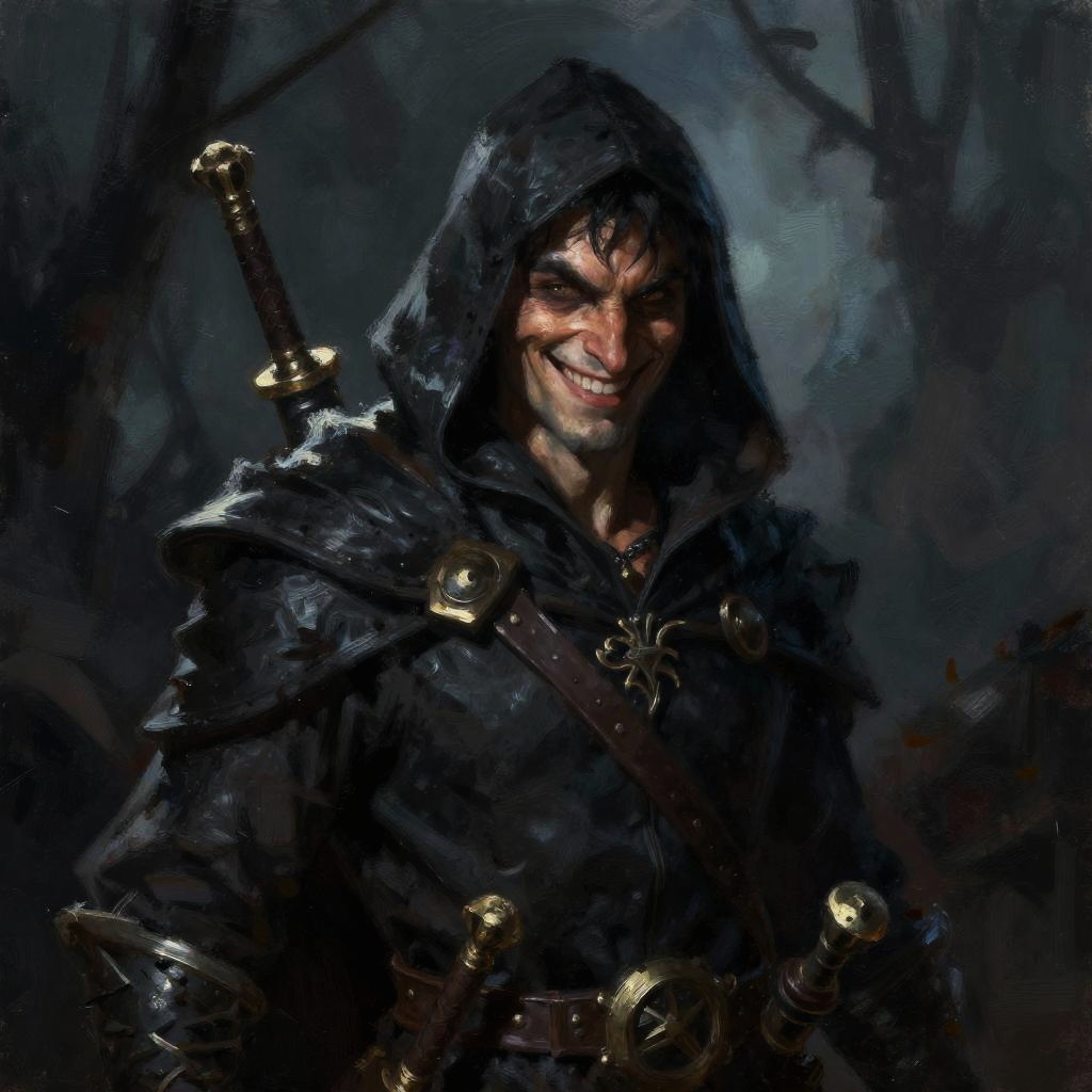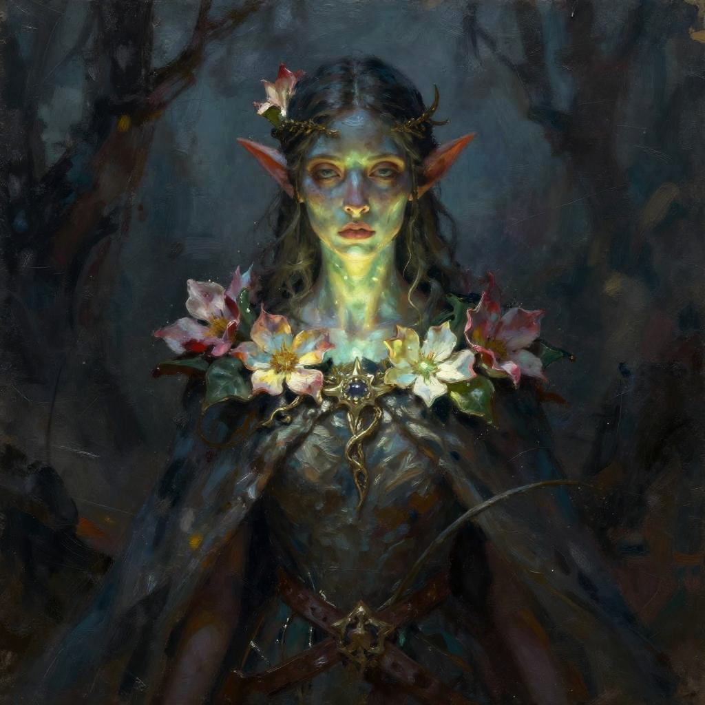 Character portrait of a high elf bard with a lute and a wistful smile, in a dark fantasy setting, speedpaint style with impressionist oil art technique. Gritty brushstrokes, mournful mood, inspired by the styles of Symbaroum, Martin Grip, and Richard Anderson.