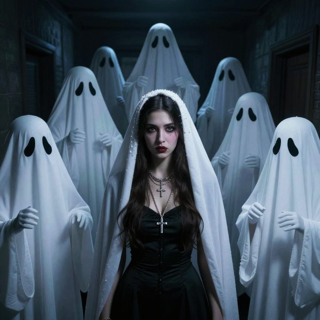 Horror Movie Scene with Ghostly Figures