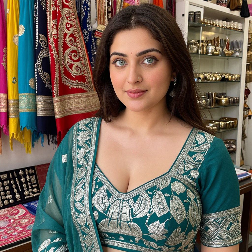 A detailed close-up of a woman with round cheekbones, bright green eyes, and a gentle expression wearing a Banarasi choli with a modern twist — combining traditional silver zari patterns with a contemporary geometric design — in a sunlit boutique in Jaipur, surrounded by textile samples and vintage Indian jewelry displays. The woman has big tits and cute face