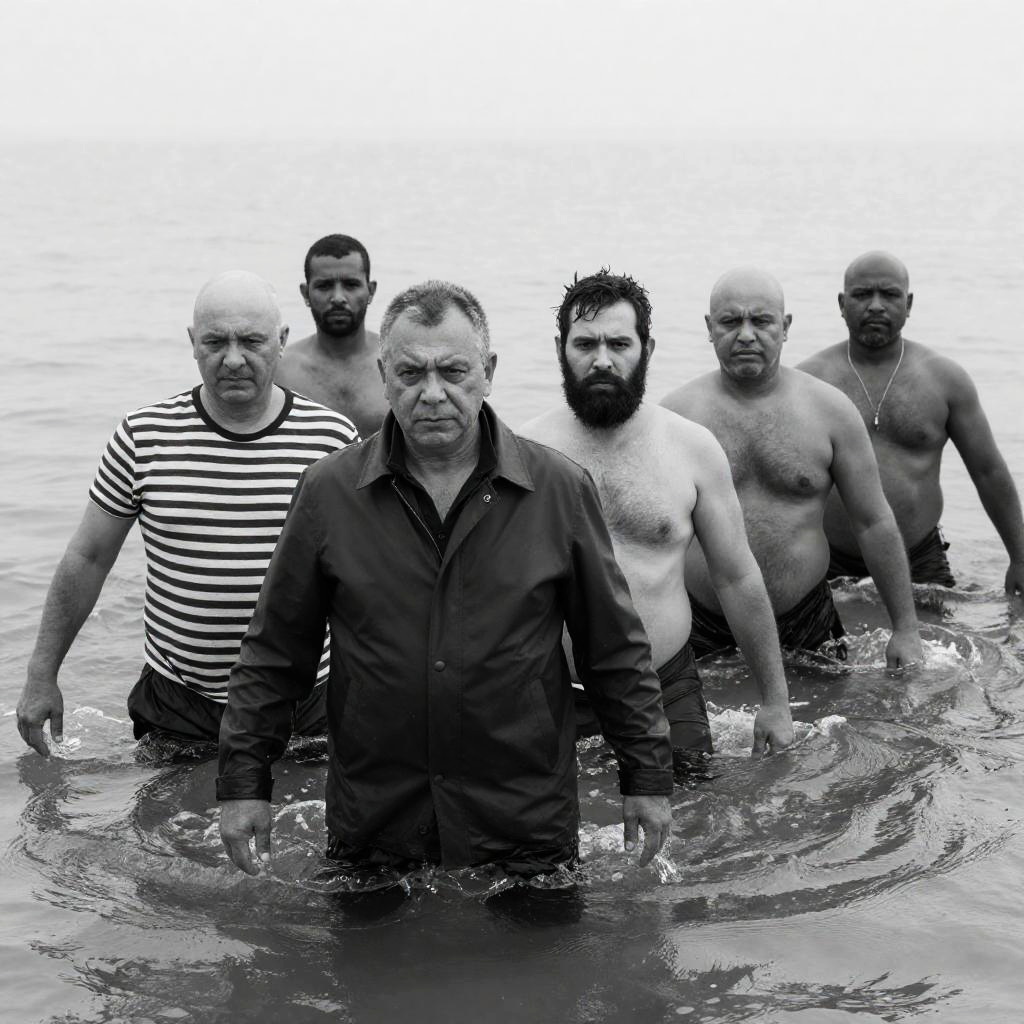 Black and white photograph of five men wading in water. Foreground shows bald man with striped shirt on left, middle-aged man in dark coat in center, bearded man with dark hair in center-right, bald man with chest exposed on right, and bald man with necklace on far right. All have intense expressions. Ripples in water surround them.