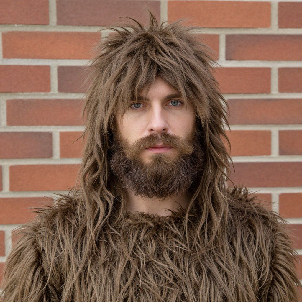 Photograph of a serious man with light skin wearing a brown and white raccoon costume, including fur ears and tail, against a plain gray background.