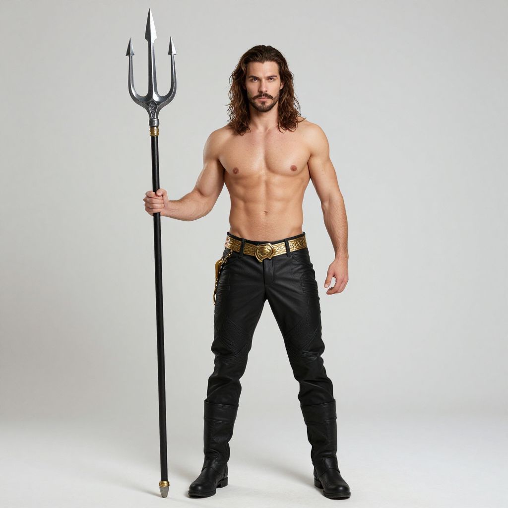 "aquaman kostume costume, 1boy, male focus, beard, facial hair, weapon, solo, polearm, long hair, topless male, trident, brown hair, muscular, standing, boots, spear, mustache, full body Realistic photo of casual sexy person with pretty face"
