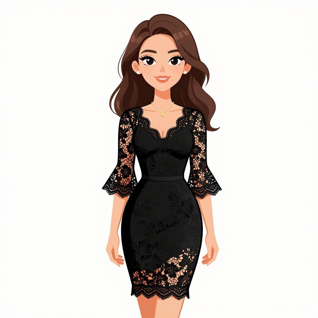 Woman with pretty face and pretty hair. smiling Woman, romantic style, black lace cocktail dress, V-neck, three-quarter bell sleeves, fitted waist, knee-length with lace trim hem, delicate gold necklace, white studio background --sref 1467