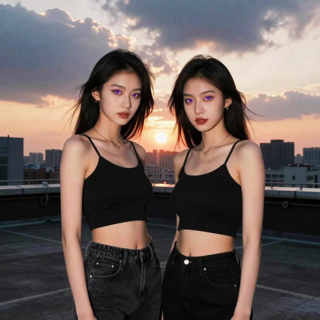 Girls with purple eyes posing confidently on a rooftop at sunset, urban skyline behind them, dramatic clouds, wind blowing through hair, cinematic lighting, high contrast, modern fashion