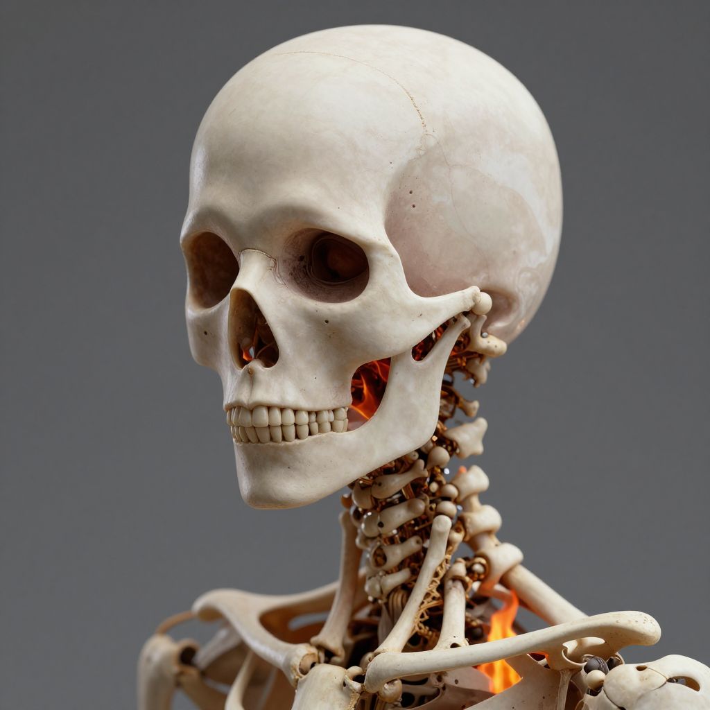 Photograph of a detailed human skeleton against a solid gray background. The skeleton's white skull has dark eye sockets and nasal cavity, with a slight crack visible on the top left. The jaw is slightly open, revealing teeth. The neck and upper torso are also visible, showing a complete rib cage and spine with small flames emerging from the lower back area, suggesting a burning effect. The light reflects off the smooth, polished bones, highlighting their texture. The overall composition is stark and macabre, focusing on the skeletal structure with a sense of eerie realism.