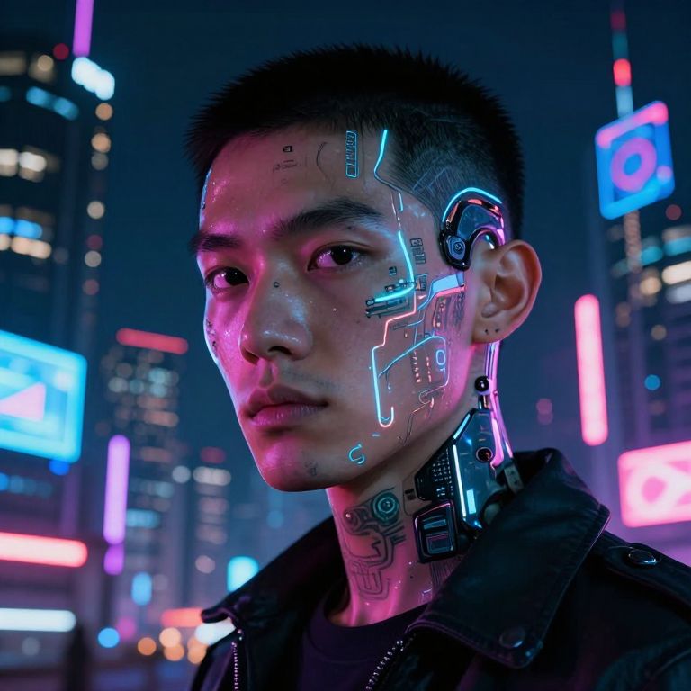 Cyberpunk portrait of an Asian man with glowing neon circuit patterns on his face and neck in a neon-lit cityscape.