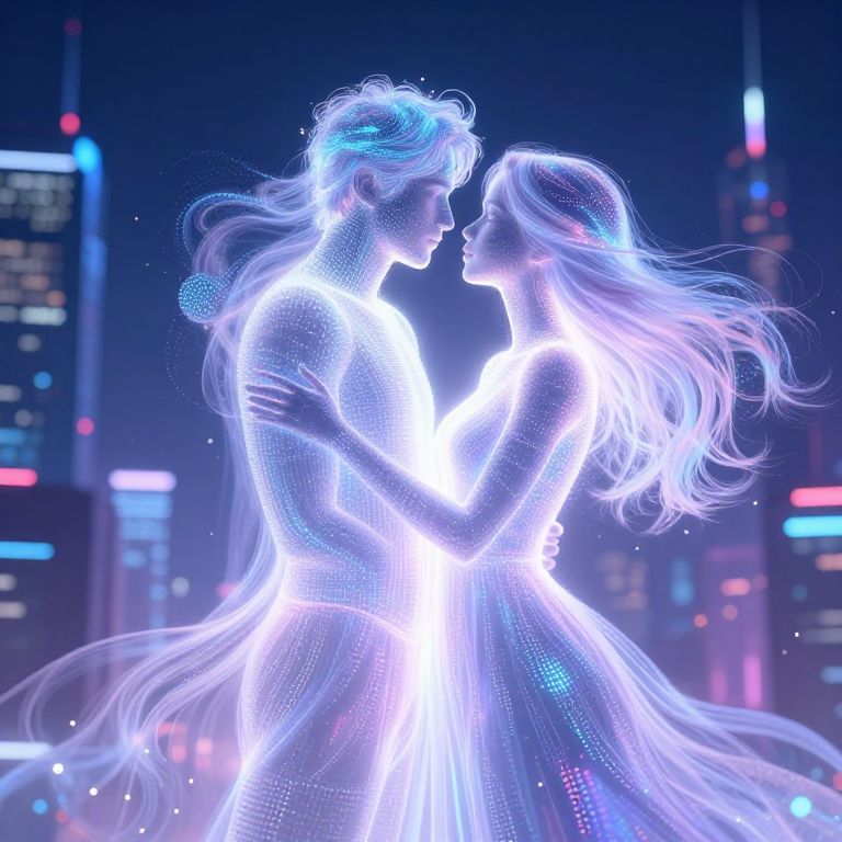 A mesmerizing digital artwork depicts two intertwined figures in a dreamlike dance, their silhouettes blending seamlessly with intricate patterns of a vibrant aurora borealis. Seen from an overhead vantage point, akin to observing through a 'crystal-eye', these lovers are suspended within a swirling vortex of iridescent lights and celestial hues. Their faces radiate serenity as they embrace beneath the enchanting glow of the northern lights, creating a harmonious fusion of love and cosmic beauty that captivates the viewer's imagination and evokes an emotional response.